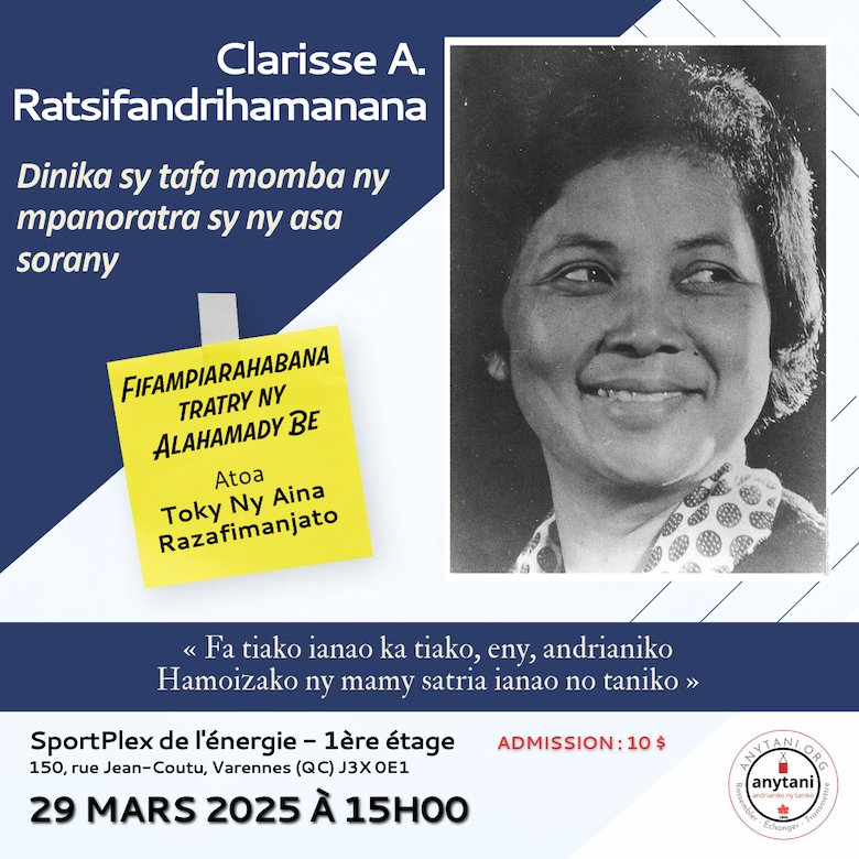 Dans le cadre de ses activités d’échanges et de mise en valeur du patrimoine immatériel de Madagascar, Anytani organise une présentation qui rend hommage à l’héritage littéraire de Clarisse A. Ratsifandrihamanana, figure emblématique de la littérature malgache. À travers trois axes majeurs, les échanges mettront en lumière son engagement profond pour la patrie et la justice sociale, sa contribution remarquable à la littérature et à l’Académie Malagasy, ainsi que des aspects de sa vie personnelle et familiale. Un voyage à la croisée des mots, des convictions et de l’humanité d’une auteure dont la voix continue de résonner bien au-delà des frontière